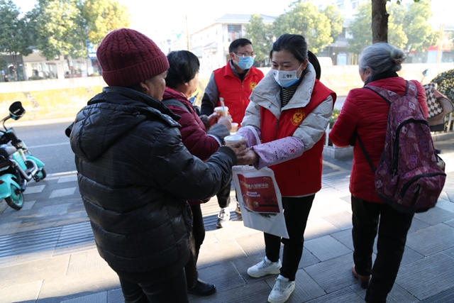 “臘八節(jié)快樂!”“喝一杯臘八粥,愿你年頭甜到年尾”……活動中,志愿者早早地將用糯米、薏米、紅豆、花生、紅棗、蓮子等熬制成的臘八粥裝杯,分發(fā)給同事、門衛(wèi)、保潔以及街道過往的行人和商鋪的老板。并送上最暖心的問候和祝福。